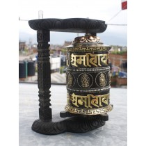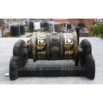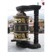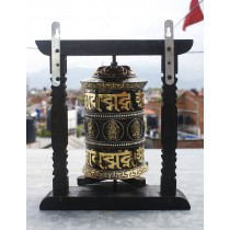 A Decorative Prayer Wheel is a traditional Tibetan Buddhist tool for reciting mantras. It consists of a brass wheel engraved with the mantra "Om Mane Padme Hum" and attached to a sturdy wooden frame. The wheel is adorned with gemstones and is designed to be spun as a form of meditation and spiritual practice. By turning the wheel, practitioners believe they can accumulate spiritual merit and purify negative karma.