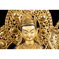 We have traditionally hand-carved the sculpture of Guru Rinpoche, also known as Guru Padmasambhava. We are the Kathmandu Valley artist whose artisan has passed to us from generation to generation. This magnificent Deity depicted sitting atop a moon disc lotus seat is mesmerizing and gives you positive energy. You can benefit from meditational or yoga activities from this statue and use it in different auspicious Buddhist rituals. It took more than a month to complete the statue since we crafted the figure in a pure copper body and gilded it with genuine 24k gold.