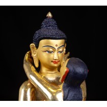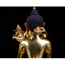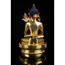 This small handmade sculpture is crafted from copper body and then gilded with genuine 24k gold of the Samantabhadra consort. Its intricate detailing and smooth finish ensures a long-lasting and eye-catching piece. Sitting on a mon disc of Lotus his two hands are placed in the lap in a meditation gesture, with the two legs folded together in vajra posture, and Samantabhadra is embraced by the consort Samantabhadri, who appears peaceful.