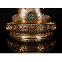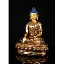 A magnificent Vajrayana art, the copper Shakyamuni Buddha Statue was painstakingly hand-carved in our workshop by professional carvers. After that, 24K gold was used for gilding the statue, giving it a gorgeous, brilliant light. The Buddha sits on a moon disc lotus seat with his right hand touching the earth, representing his calling to the earth to witness his victory over Mara or the moment of his enlightenment.