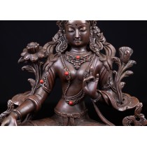 The Beautiful Green Tara Sculpture in Traditional Nepal Art was artistically hand-carved by us, utilizing a traditional Himalayan sculpting method. With a contented look and a lotus in each palm, we portrayed the female Buddha sitting atop the moon disc lotus throne. The body is made of oxidized copper body. We spent more than a month working in our workshop to create the hand-craving for pattern designs on the statue's crown, utpala, and robe. This statue may be utilized for several Buddhist rites and regular exercises like yoga and meditation.