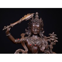 Manjushree is depicted seated in a meditative posture. His right-hand holds the flaming sword, symbolizing the power to cut through ignorance, while his left-hand cradles the Prajnaparamita Sutra, representing the ultimate wisdom. His calm and enlightened expression reflects his deep connection to wisdom and compassion, offering spiritual guidance to all who seek his blessings.