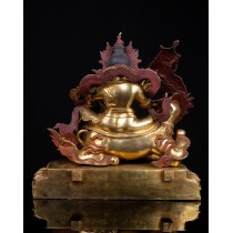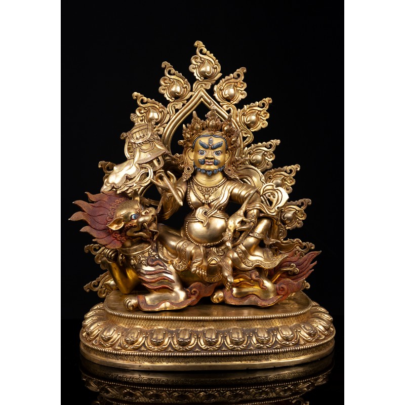 In Buddhism, Kubera, the lord of wealth who is magnificently portrayed, has a counterpart named God (Namtoshe). By Nepali artists from Kathmandu, Nepal, this intricately hand-carved statue took several months to sculpt. Namtoshe is shown sitting on a roaring lion resting on a lotus. He is depicted holding a triumph banner in his right hand and a wish-granting jewel for a mongoose in his left, establishing him as the wealth deity. In honor of the Five Transcendental Buddhas, he is donning a crown with five prongs. In addition to sporting jewelry, he is dressed in a long, flowing scarf.