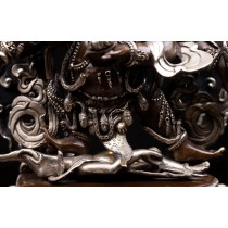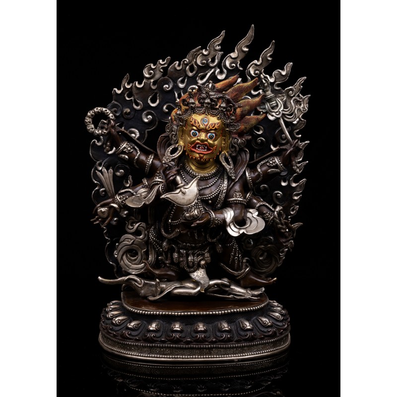 This statue is crafted from oxidized copper, giving it a dark and aged appearance that enhances its powerful presence. The intricate details in Mahakala’s armor, facial features, and symbolic implements are meticulously carved, reflecting the skill and dedication of the artisans. The oxidation process gives the statue a timeless and sacred aura, ideal for meditation spaces and altars