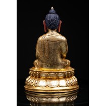 Shakyamuni Buddha Statue symbolizes the Buddha's deep teachings and the path to spiritual awakening. This handcrafted statue made up of copper, decorated with 24K gold gilding, and enhanced with gold and acrylic paints. This sacred statue, created by expert Nepalese artisans, represents the craftsmanship of Himalayan Buddhism, making it an inspirational addition to altars, meditation places, or sacred collections.