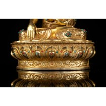 A magnificent Vajrayana art, the copper Shakyamuni Buddha Statue was painstakingly hand-carved in our workshop by professional carvers. After that, 24K gold was used for gilding the statue, giving it a gorgeous, brilliant light. The Buddha sits on a moon disc lotus seat with his right hand touching the earth, representing his calling to the earth to witness his victory over Mara or the moment of his enlightenment.