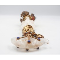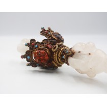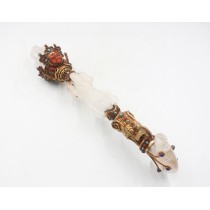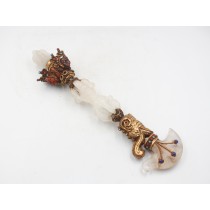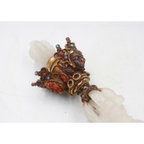 Presenting the Tibetan Knife Phurba, an exquisite fusion of age-old artistry and mystical meani This gorgeous phurba, handcrafted on a copper body and gracefully electroplated in gold, is embellished with lapis lazuli, ruby, turquoise, and crystal.