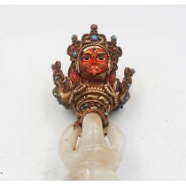 Presenting the Tibetan Phurba, an exquisite fusion of age-old artistry and mystical means. This gorgeous phurba, handcrafted on a copper body and gracefully electroplated in gold, is embellished with lapis lazuli, ruby, turquoise, and crystal.