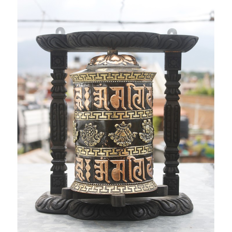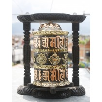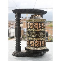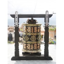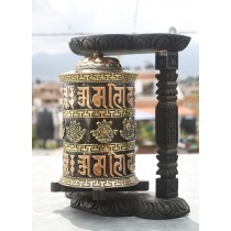 A Decorative Prayer Wheel is a traditional Tibetan Buddhist tool for reciting mantras. It consists of a brass wheel engraved with the mantra "Om Mane Padme Hum" and attached to a sturdy wooden frame. The wheel is adorned with gemstones and is designed to be spun as a form of meditation and spiritual practice. By turning the wheel, practitioners believe they can accumulate spiritual merit and purify negative karma.