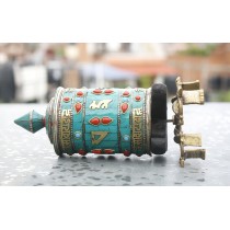 A Decorative Prayer Wheel is a traditional Tibetan Buddhist tool for reciting mantras. It consists of a brass wheel engraved with the mantra "Om Mane Padme Hum" and attached to a sturdy wooden frame. The wheel is adorned with gemstones and is designed to be spun as a form of meditation and spiritual practice. By turning the wheel, practitioners believe they can accumulate spiritual merit and purify negative karma.